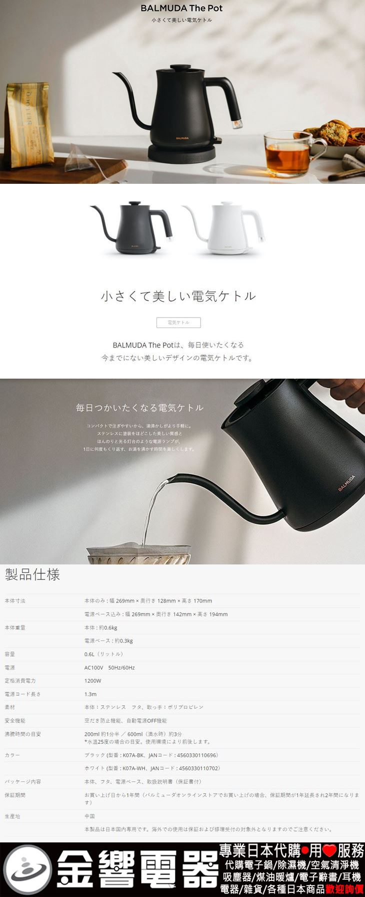 【金響代購】空運,BALMUDA K07A-BK黑色(日本國內款):::BALMUDA The Pot,電熱水壺,快煮壺,咖啡壺,0.6L,取代,K02A-BK