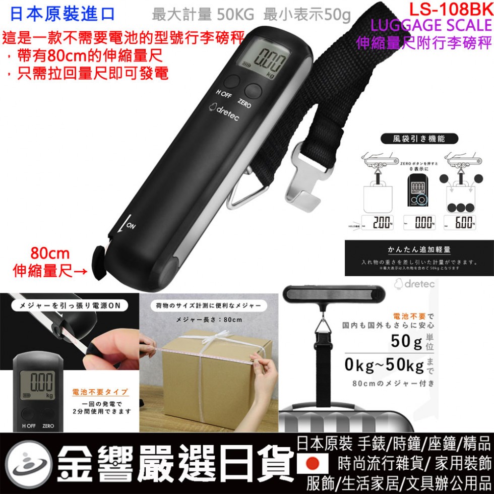 旅行行李和快遞行李等,掛起來行李的重量會增加,具有防止忘記切斷電源功能和自動關閉電源的節能設計。這是一款"不需要電池"型號的伸縮量尺附的行李磅秤,帶有80cm的測量的伸縮量尺,只需拉回測量即可發電。