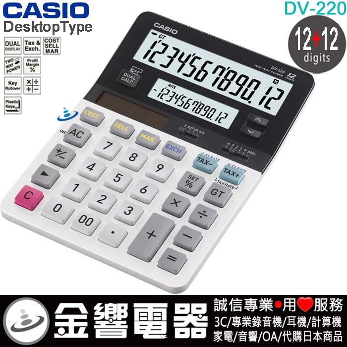 已完售,CASIO DV-220-N(公司貨,保固2年):::大型桌上型商用計算機(12位數),卡西歐獨家雙螢幕計算機,DV220