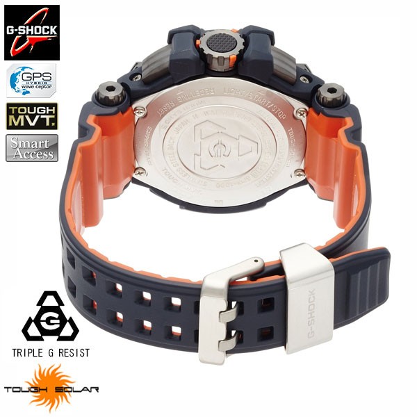 世界初※となるハイブリッドの時刻取得システムを搭載。密林や砂漠、海上、さらには都会のビル群や屋内まで、全世界エリアでGPS電波受信機能と世界6局の標準電波受信機能を使い分け、正確な時を確実に刻む“G-SHOCK”です。針駆動用に超小型モーターを採用することにより、ハイブリッドの時刻取得システムを実装するスペースを確保。また、低消費電力GPS用受信 LSIと、高効率で発電する新形状のソーラーセルを採用し、消費電力の増大にも対応しました。さらに、セラミック製のGPSアンテナや、ケースに配したファインレジンにより、高い受信感度と耐衝撃性を両立しています。