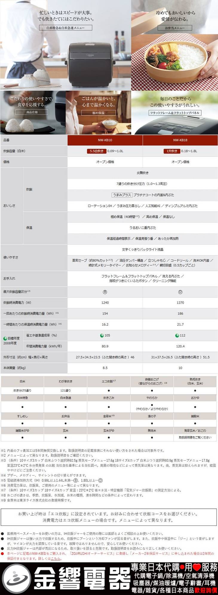 已完售,ZOJIRUSHI NW-KB18-BZ黒漆(日本國內款):::2019年最新,日本製,象印壓力IH電子鍋,1升炊き,10人份,炎舞炊き,豪炎かまど釜,刷卡或3期率,NWKB18
