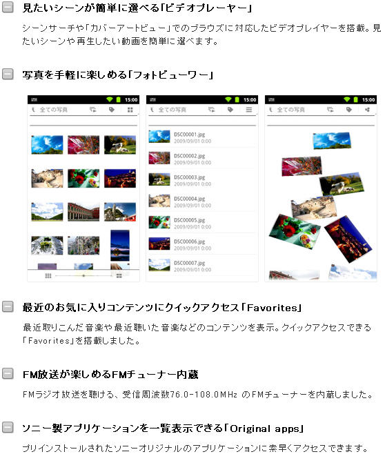NW-Z1000系列數位隨身聽誕生,搭載Android 2.3(TM),高音質享受音樂、照片和動畫的播放、內建藍牙、FM收音機(76.0~108.0MHz)降噪功能、Wi-Fi連接的網路瀏覽功能也對應、因為對應Android Market,可以下載遊戲等愛好的應用軟件APP充份利用隨身聽,帶您感受每個音符的極致熱情。