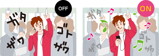 ※ 付属のヘッドホン、または別売のノイズキャンセリング機能搭載“ウォークマン”専用ヘッドホン(MDR-NWNC33、MDR-NWNC200)を使用時のみ有効です。周囲の騒音がまったく聞こえなくなるわけではありません