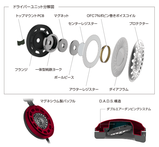 強度と軽さを兼ねる高純度アルミニウムハウジングの中に、日本の職人が丁寧に作り上げ、音の深みを追求したドライバーを搭載。過渡特性を改善して音の再現性を高める“一体型純鉄ヨーク”により、ドライバーの駆動力を向上。さらに、最高峰の純度を誇るOFC-7Nボビン巻きボイスコイルや超硬質カーボン材による特殊コーティングを施したダイアフラム、空気の流れを均一化し歪みのない正確な振動板の動きを引き出すトップマウントPCB方式を採用。