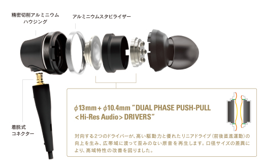 ● φ13mm+φ10.4mmの異口径ドライバーで高域特性を改善しハイレゾ音源も余裕の高解像度再生。