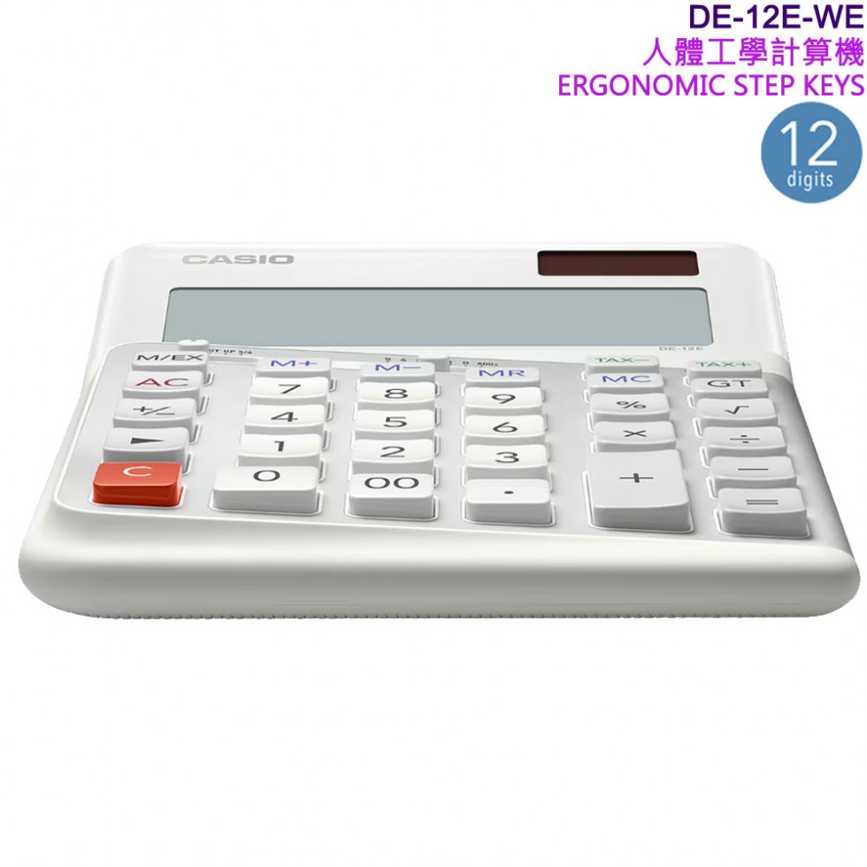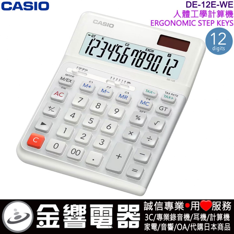 ●金響電器,現貨,CASIO DE-12E-WE白色(公司貨,保固2年):::桌上型商用計算機,12位數,人體工學計算機