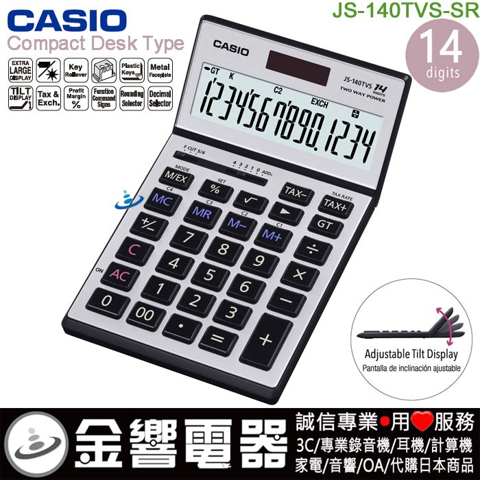 缺貨,CASIO JS-140TVS-SR銀色(公司貨,保固2年):::中型桌上型超薄商用計算機,螢幕角度可調整,14位,HEAVY DUTY,專業型,取代JS-140V,JS140TVS