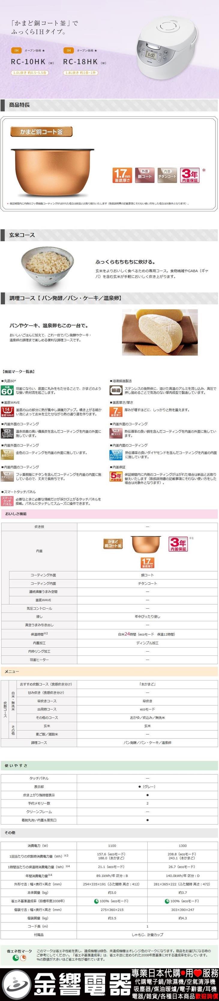 【金響代購】空運,TOSHIBA RC-10HK-W(日本國內款):::東芝,IH電子鍋,5.5合炊,6人份,かまど銅コート釜,刷卡或3期,RC10HK