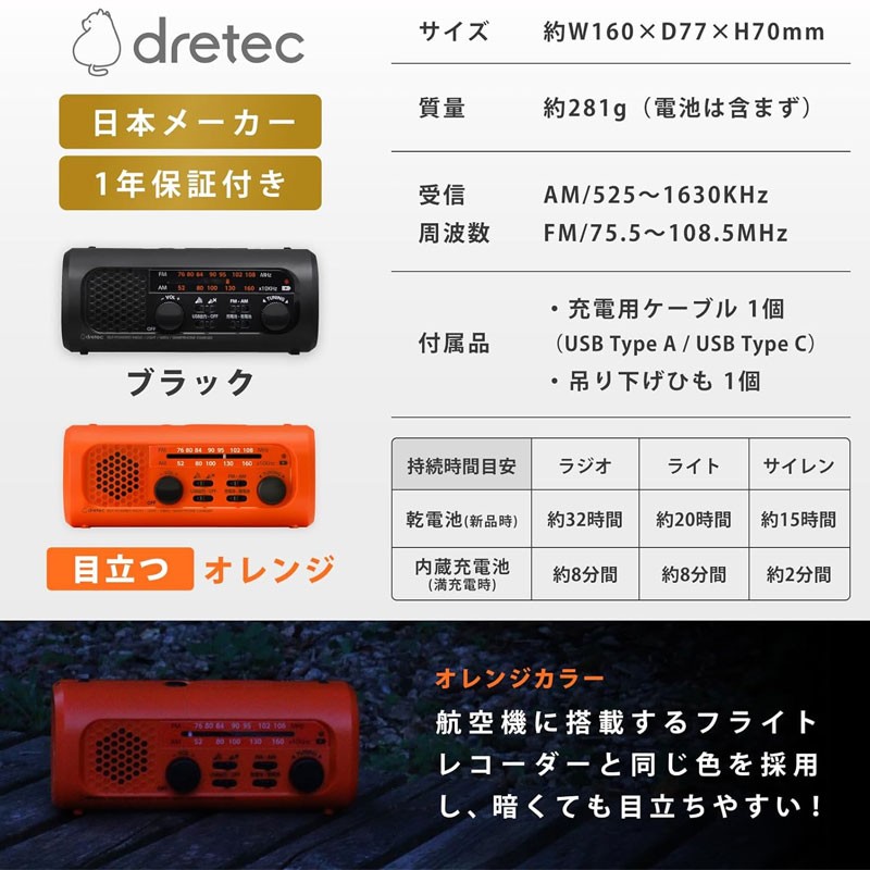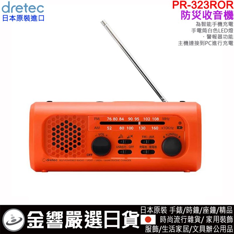 dot 【金響日貨】現貨,dretec PR-323ROR(日本原裝):::防災多功能收音機,FM,AM,手機充電,手回發電,LED照明,警報功能,PR323ROR