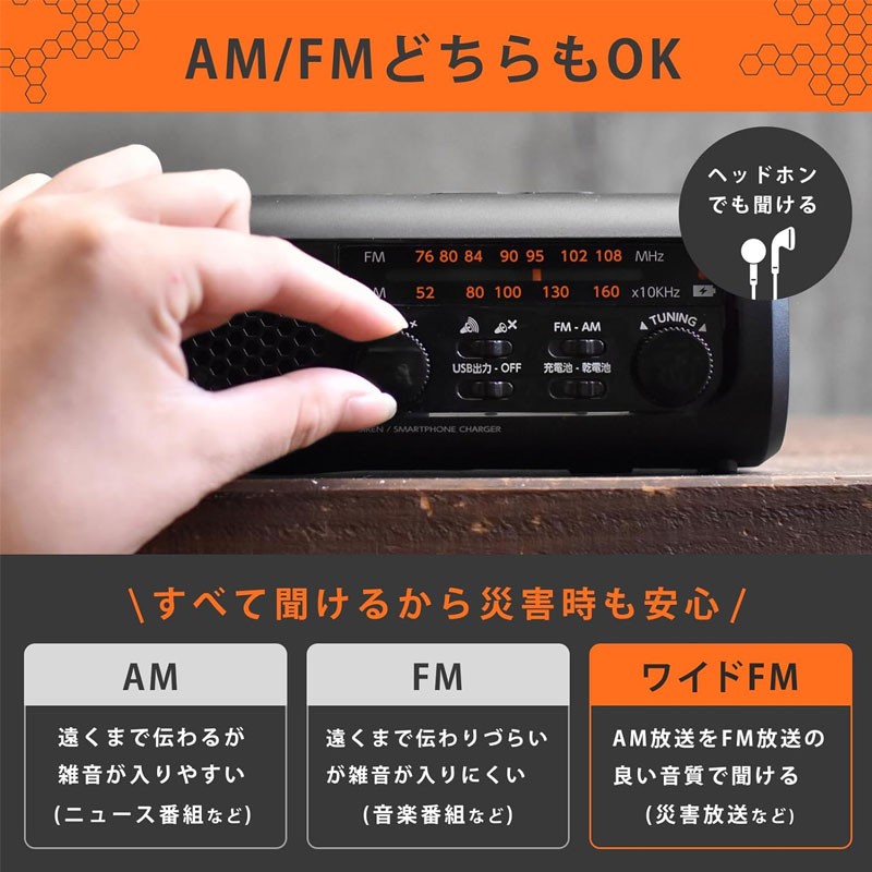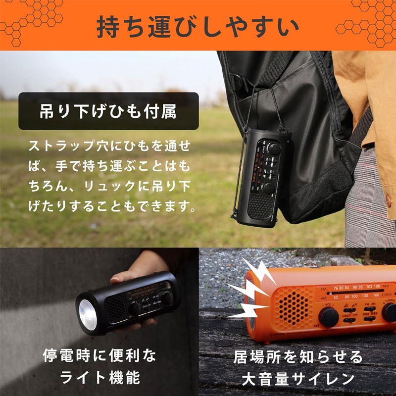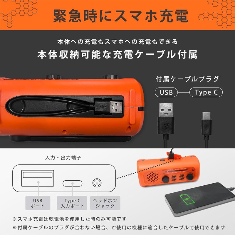 可保存10年,即使長時間放置也可充電 (採用內置充電電池) 只需插入USB即可為智能手機/手機充電,內置充電電池可通過手搖發電充電。具備緊急情況下收集信息的收音機功能、突發災害時方便的警報器功能、停電時方便的白色LED燈等多功能商品。