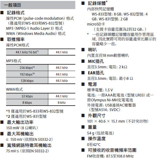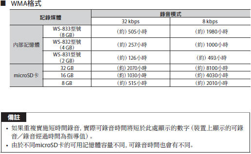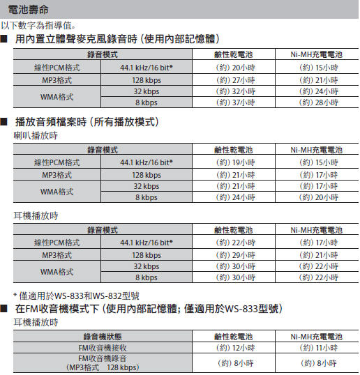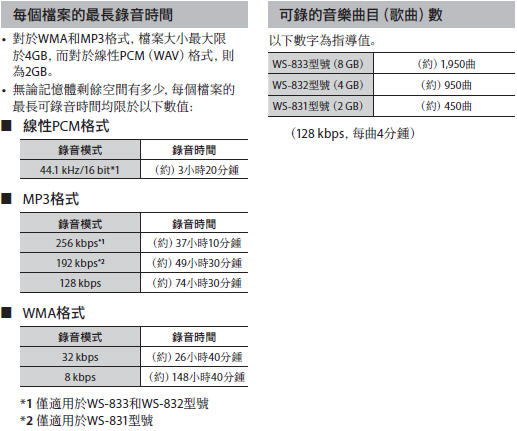 藉由內建記憶體可直接透過USB埠存取錄音筆內部資料。WS-833與WS-832備有額外內建充電電池,