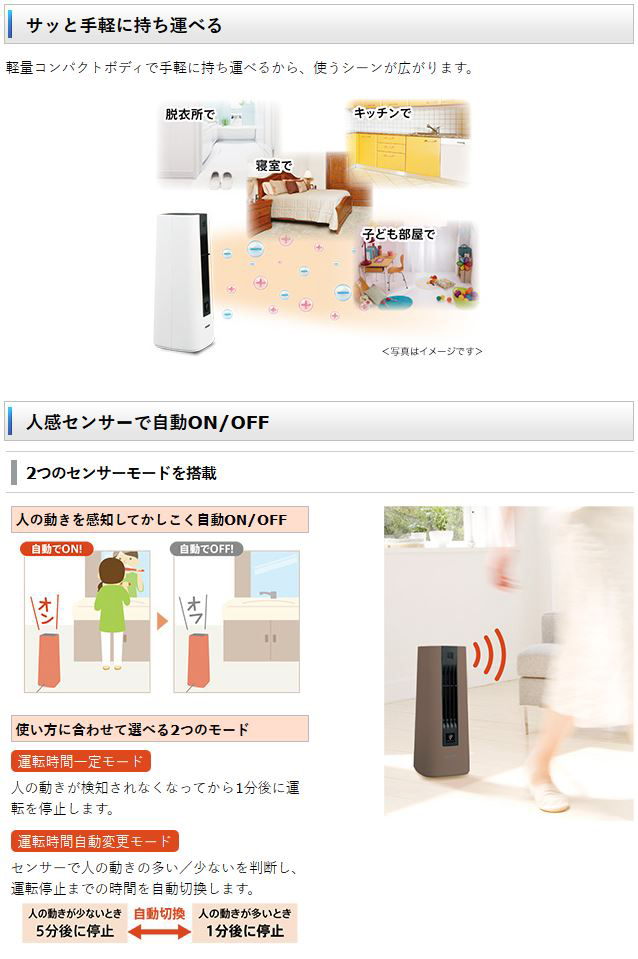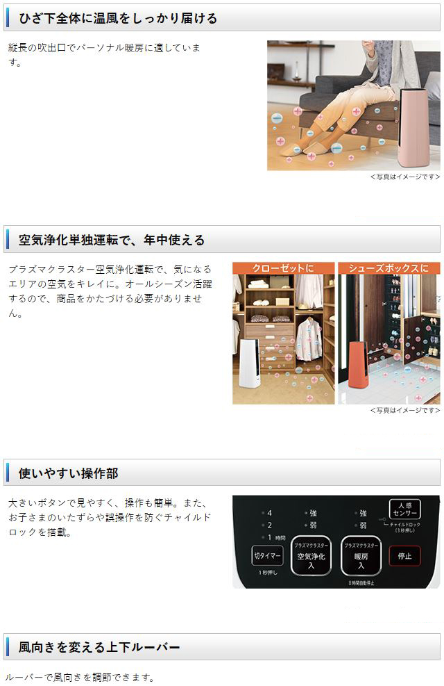 ●プラズマクラスター暖房運転 ●プラズマクラスター空気浄化運転 ●抗菌(注4)・防カビ(注5)エアフィルター ●転倒自動停止装置 ●切り忘れ防止機能(暖房時)(注6) |