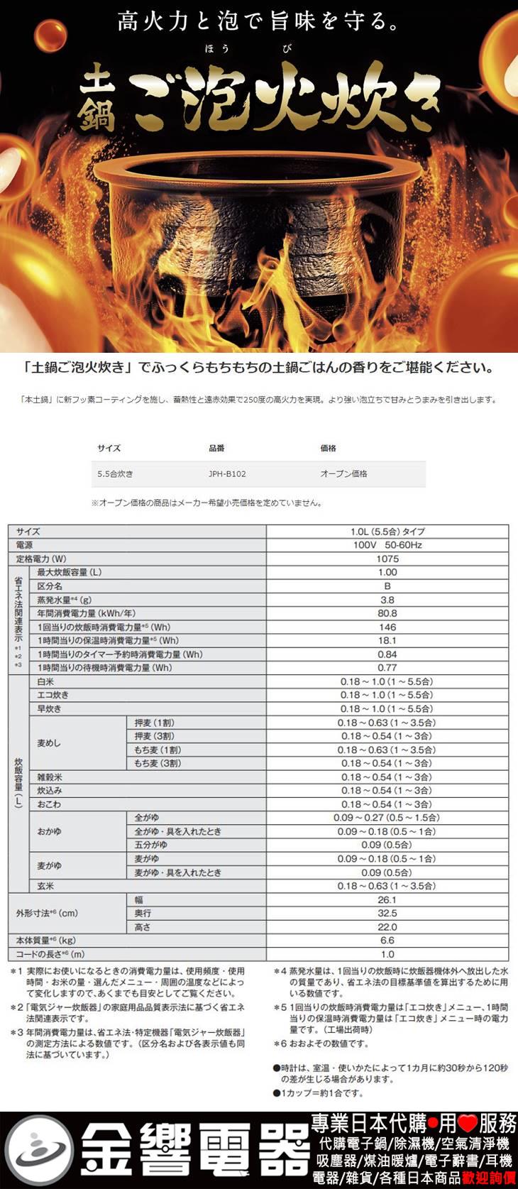 dot 【金響代購】空運,TIGER JPH-B102KW(日本國內款):::2019年最新,日本製,虎牌,土鍋壓力IH電子鍋,土鍋圧力IH炊飯器,5.5合炊,6人份,炊きたて,土鍋ご泡火炊き,刷卡或3期,J