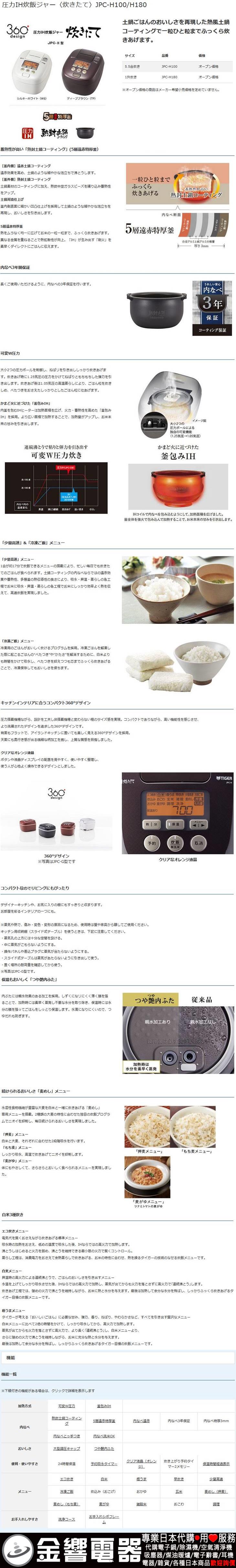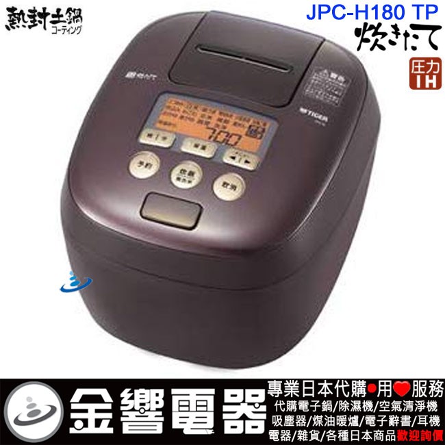 dot 金響電器‧金響日貨:::歡迎蒞臨金響門市參觀選購 EST.1995 » 日本代購 » 廚房家電 » 電子鍋(日本國內款) » 虎牌電子鍋 » 9~10人份電子鍋 » 【金響代購】空運,TIGER JPC-H180TP(日本國內款):::2019年最新,日本製,虎牌,壓力IH電子鍋,圧力IH炊飯器,1升炊き,10人份,炊きたて,360°デザイン,刷卡或3期,JPCH