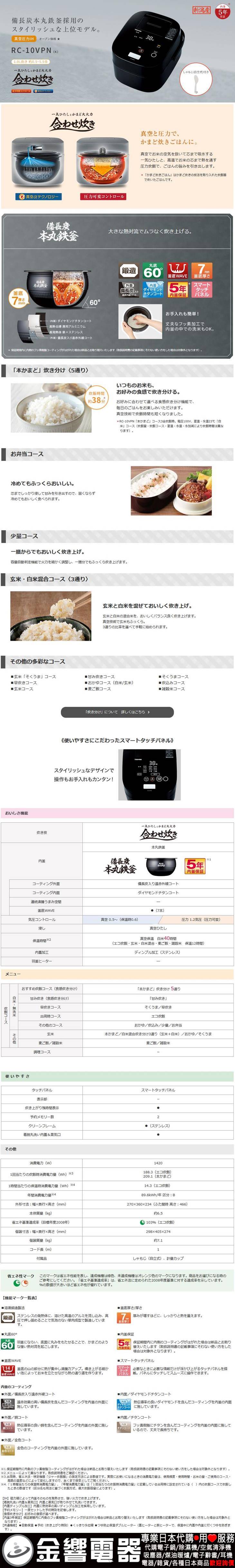 【金響代購】空運,TOSHIBA RC-10VPN-K(日本國內款):::2019年,日本製,東芝,真空壓力IH電子鍋,5.5合炊,6人份,備長炭,本丸鉄釜,刷卡或3期,RC10VPN